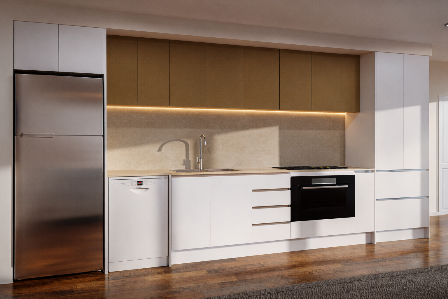 Cabinets in 16mm HMR E1 Grade Particle Board, Doors in MRMDF E1 Grade, Bench Tops in 20mm Porcelain & Granite
