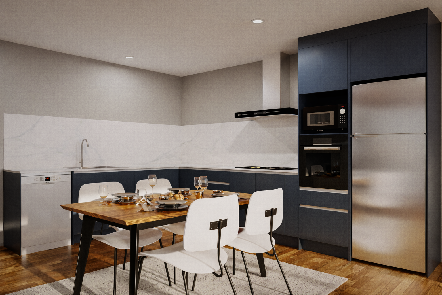 Cabinets in 16mm HMR E1 Grade Particle Board, Doors in MRMDF E1 Grade, Bench Tops in 20mm Porcelain & Granite