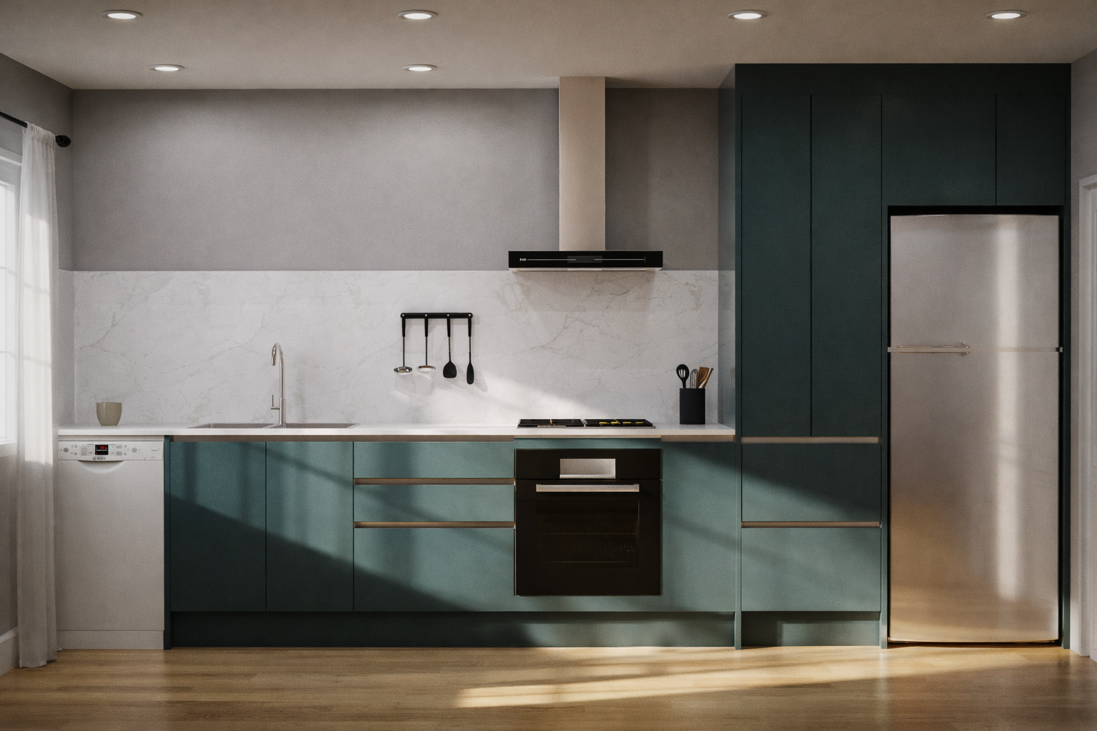 Cabinets in 16mm HMR E1 Grade Particle Board, Doors in MRMDF E1 Grade, Bench Tops in 20mm Porcelain & Granite