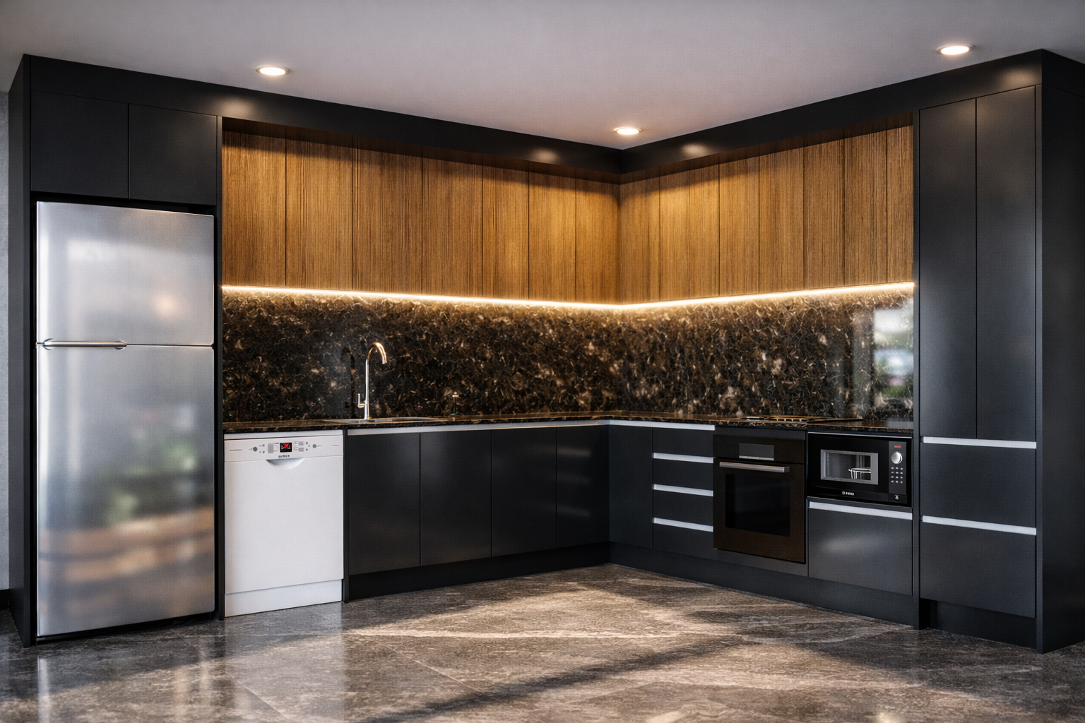 Cabinets in 16mm HMR E1 Grade Particle Board, Doors in MRMDF E1 Grade, Bench Tops in 20mm Porcelain & Granite