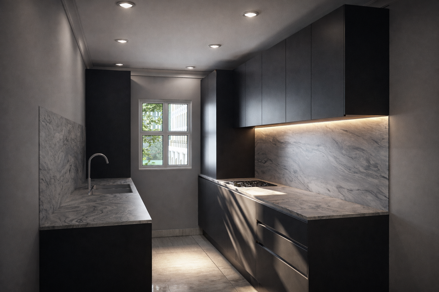 Cabinets in 16mm HMR E1 Grade Particle Board, Doors in MRMDF E1 Grade, Bench Tops in 20mm Porcelain & Granite